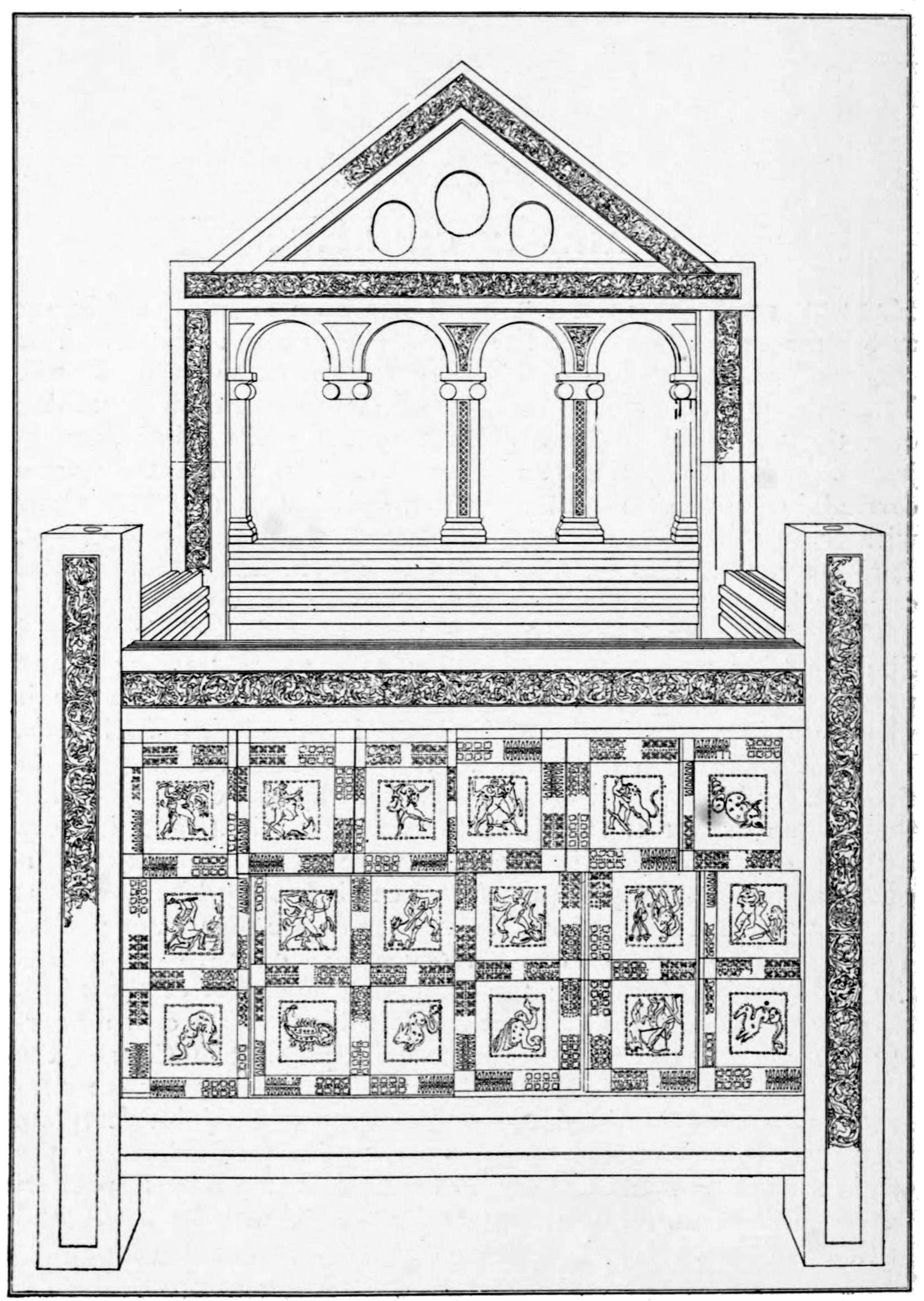 The seat is about one foot ten inches above the ground, and two feet eleven and seven-eighths inches wide; the sides are two feet one and one-half inches deep; the height of the back up to the tympanum is three feet five and one-third inches; the entire height of the chair is four feet seven and one-eighth inches. According to the examination then made by Padre Garucci and Giovanni Battista de Rossi, the oldest portion...is a perfectly plain oaken arm-chair with four legs connected by cross-bars. The wood is much worm-eaten, and pieces have been cut from various spots at different times, evidently for relics. To the right and left of the seat four strong iron rings, intended for carrying-poles, are set into the legs. At a later date, perhaps in the ninth century, this famous chair was strengthened by the addition of pieces of acacia wood. The latter wood has inlaid in it a rich ornamentation of ivory. For the adornment of the front of the seat eighteen small panels of ivory have been used, on which the labours of Hercules, also fabulous animals, have been engraved; in like manner it was common at this period to ornament the covers of books and reliquaries with ivory panels or carved stones representing mythological scenes. The back is divided by small columns and arches into four fields and finishes at the top in a tympanum which has for ornamentation a large round opening between two smaller ones. The tympanum is surrounded on all sides by strips of ivory engraved in arabesques. At the centre of the horizontal strip a picture of an emperor ... is carved in the ivory; it is held to be a portrait of Charles the Bald. The arabesque of acanthus leaves filled with fantastic representations of animals, and the rough execution of the work, would make the period of this emperor (884) a probable date. What still remains of the old cathedra scarcely permits an opinion as to the original form. In any case it was a heavy chair made of plain, straight pieces of wood, so that it cannot be considered a sella curulis of Pudens, as earlier tradition held it to be. If the four rings on the two sides belong to the original chair (Ennodius of Pavia about the sixth century used the term sedes gestatoria as an expression universally understood in reference to this chair), then it was probably an ordinary carrying-chair, such as was commonly used in ancient Rome.